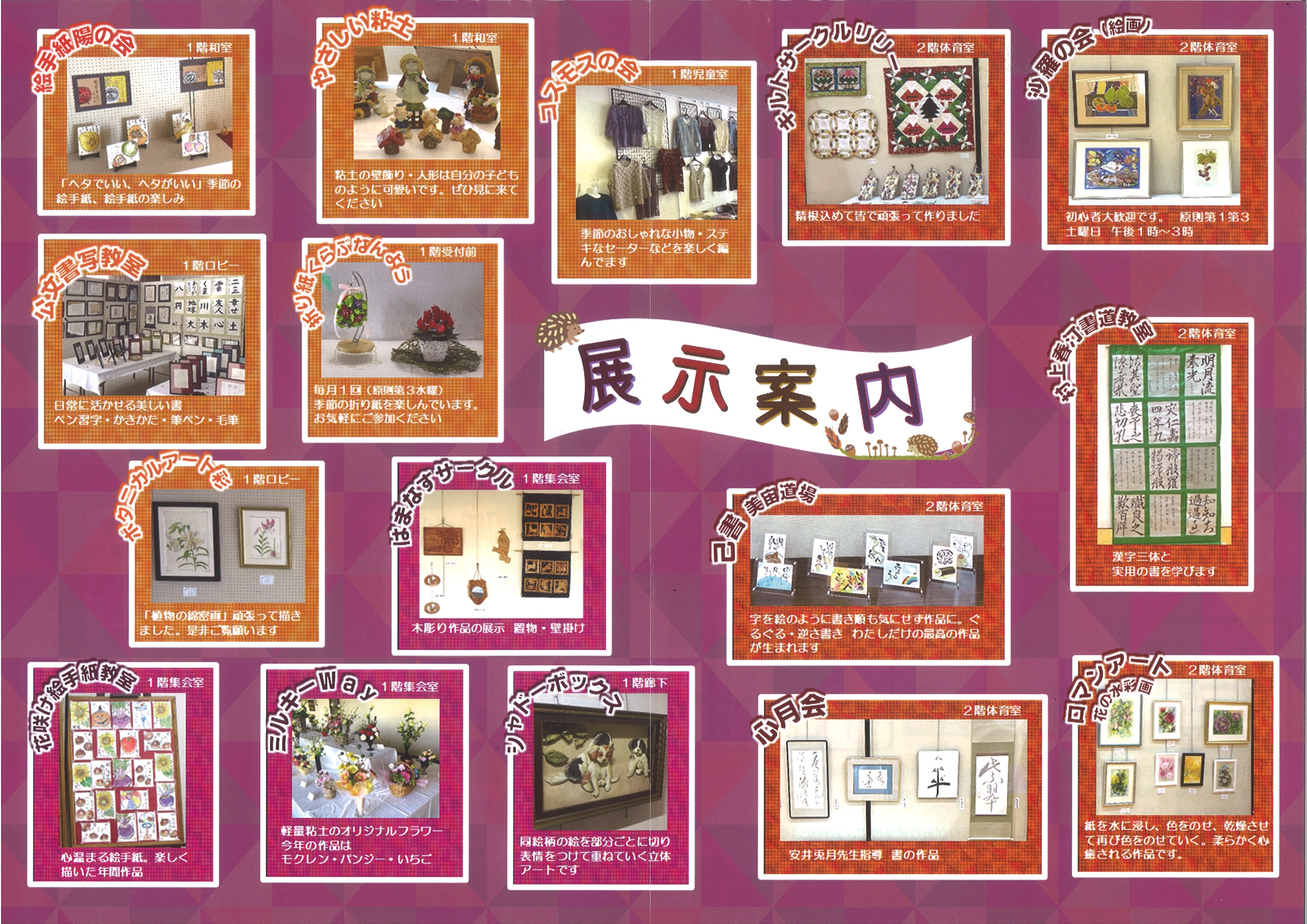 アクリル画・水彩画・油彩画・俳画・ボールペン画・ビーズ作品など、様々な創作活動の成果が発表されています。